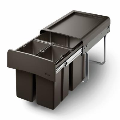 Das Mülltrennsystem Clap 2/450-3 ist mit seiner geringen Einbauhöhe ein praktisches Raumwunder. Es ist designt für die mühelose Integration in Unterschränke oder Spülenunterschränke mit Drehtürtechnik. Der Zugriff auf die dazugehörigen Behälter erfolgt über einen kugelgelagerten Teleskop-Vollauszug in langlebiger Qualität. Die drei Abfallsammler haben ein Füllvolumen von 2x 7,5 Litern und 1x 15 Litern. Es werden die optimalen Voraussetzungen geschaffen, um beispielsweise Biomüll, Restmüll und Wertstoffe getrennt voneinander bis zur Entsorgung sauber aufzubewahren. Das Herausnehmen der Mülleimer wird durch Tragehenkel erleichtert. Zu den weiteren vorteilhaften Ausstattungsmerkmalen des Mülltrennungssystems zählt der Gesamtdeckel mit Umrandung, der sich als praktische Ablage für Putzutensilien und Müllsäcke anbietet. Der bei der Fertigung verwendete Kunststoff ist komplett recycelbar und punktet darüber hinaus mit pflegeleichten Oberflächen. Die Montage des Tragegestells erfolgt auf dem Schrankboden.
